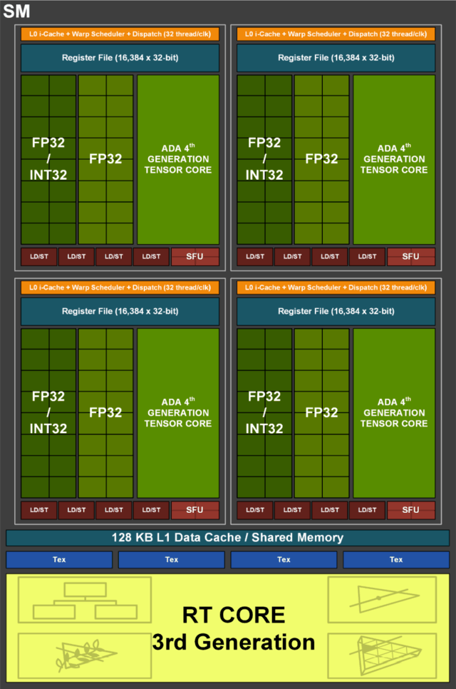 其实根据完整的架构图就能看出,此次Ada架构整体结构性的改动并不大,这一点从SM单元便能清晰印证,同样的FP32 CUDA核心,同样的FP32/INT32混合CUDA核心,同样的L1级缓存等等。当然,每个SM单元内部的Tensor Core升级为第四代。