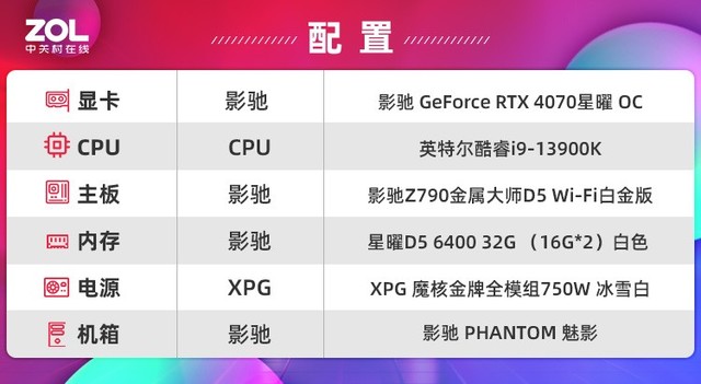 本次测试平台的处理器采用了Intel最新的13代i9-13900K,性能绝对强悍,电源采用了XPG 魔核金牌全模组750W 冰雪白,这款电源经过了80PLUS金牌认证,高效转化输出完美支持30系列和40系列显卡稳定运作,电源全模组化,体积小巧,14cm短机身设计, RTX4070功耗不高,750W的电源完全够用。这款电源采用全日系电容高品质保障,拥有多接口线材,支持双显卡/双CPU 运作,适用各类极客玩家,全壳和线材采用白色设计,让白色控玩家毫无抵抗力 ,与影驰 RTX4070 星曜 OC显卡 纯白配色相呼应。