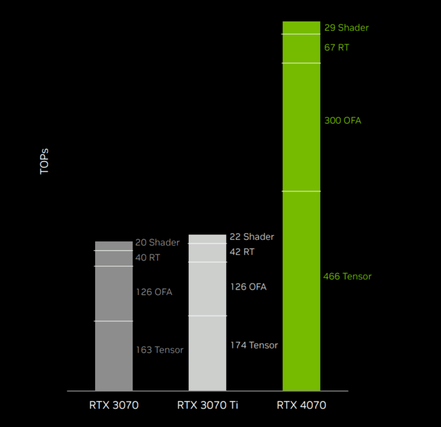 而在中端的RTX 4070上也达到了惊人的466 Tensor-TFLOPS,相比上一代RTX 3070 Ti,拥有2.7倍左右的提升。