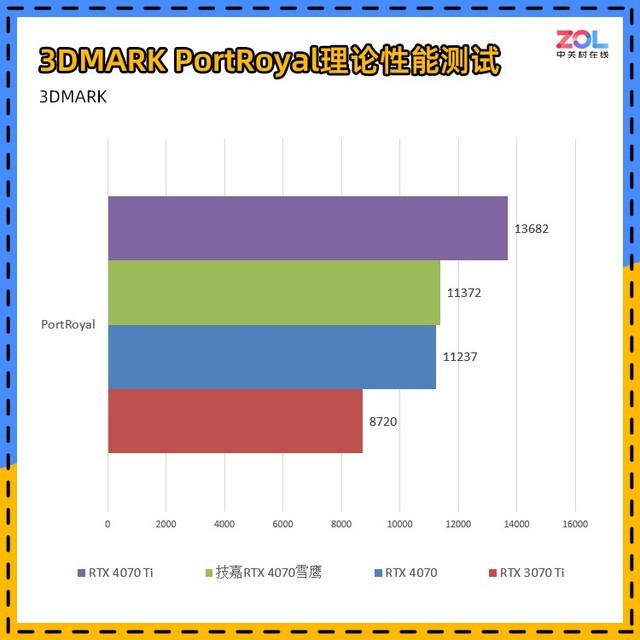PortRoyal是3DMARK中专门针对光追性能的测试项,技嘉 RTX4070雪鹰相较RTX 3070 Ti的提升约为30%。