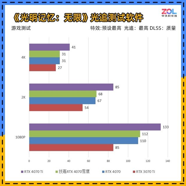 《光明记忆:无限》的光追测试软件是独立于游戏的测试工具,比游戏中用到的光线追踪技术更多,测试条件为“RTX最高/DLSS质量”。所以测试帧数相对较低,但实际游戏配置相当亲民。