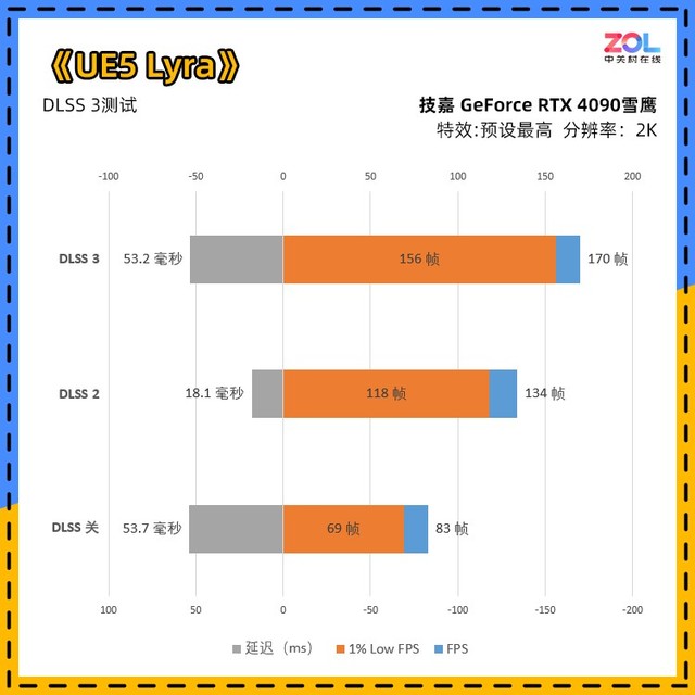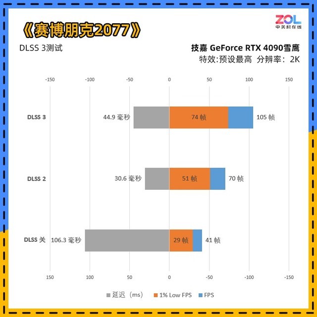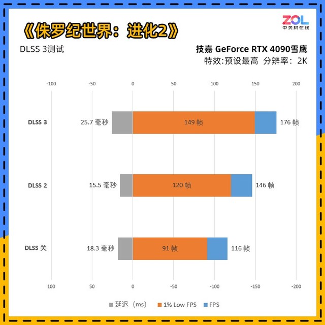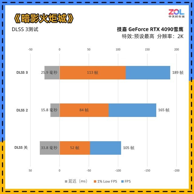 本次DLSS 3的测试图表比较繁琐,并且增加了1% Low FPS和延迟的测试。