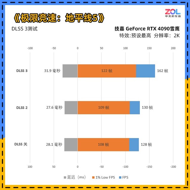 《极限竞速:地平线5》是最新加入DLSS 3的游戏,可以看到,即便在开启DLSS 2的情况下,帧数受到CPU瓶颈限制,几乎与DLSS关闭帧数相同。而在开启DLSS 3后,一下跃至162帧,提升27%。