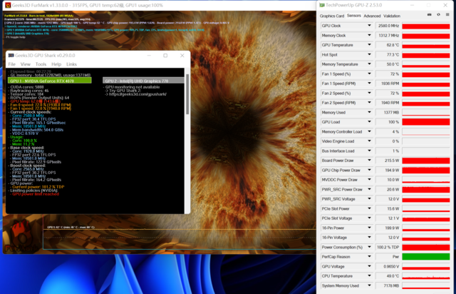 可以看到技嘉 RTX4070雪鹰这张显卡对于温度的控制非常不错,我们评测室温控制在26℃左右,通过20分钟左右的拷机测试,TDP达到100%,板载功耗为215W;温度一直控制在63℃左右,热点温度在77℃左右。