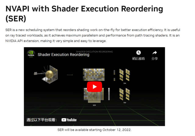 SER主要的作用是提升着色器性能,它可以将效率低下的工作负载,动态重组为更高效的工作负载。主要针对光线追踪的性能提升非常大。