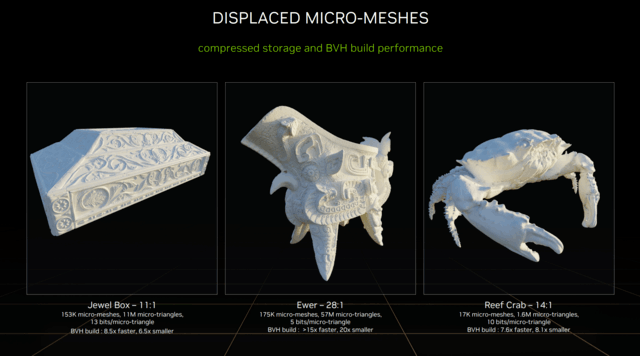 Displaced Micro-Mesh Engines可理解为微网格置换引擎,它构建光线追踪的BVH(Bounding volume hierarchy)的速度提高了10倍!所使用的的显存减少了20倍!