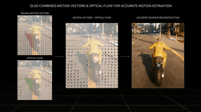 光流加速器在原本DLSS 2的基础上,还可以计算两个连续帧内的光流场,能够捕捉游戏画面从第1帧到第2帧的方向和速度,从中捕捉粒子、反射和光照等像素信息。并分别计算运动矢量和光流来获得精准的阴影重建效果。