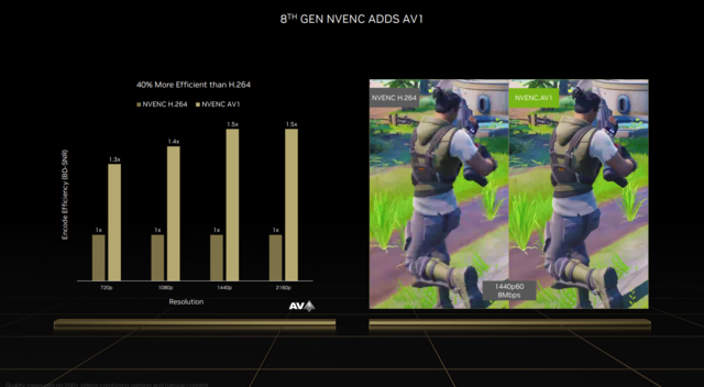 本次升级的第八代NVENC编码器可以说是直播、视频、后期工作者的极大福音。它首次加入了对AV1编码的支持,最显而易见的效果就是直播。