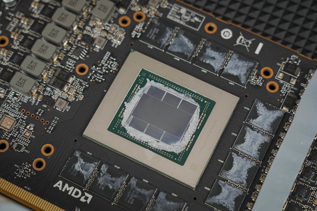拆解后我们能更清楚地看到这颗Navi31芯片的大小核心,RDNA3架构最大的不同则是采用了双芯片的封装结构,其中更加先进的5nm工艺为GCD主芯片,而较成熟的6nm的制程来打造GDDR 6显存接口MCD芯片,和第二代高速缓存Infinity Cache。