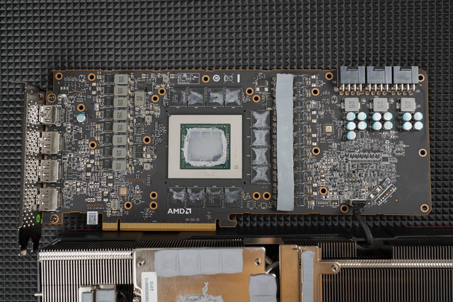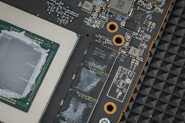 瀚铠 RX7900XTX采用了SKhynix海力士单颗2GB显存,在核心周围共有12颗,排布的整整齐齐没有空焊。