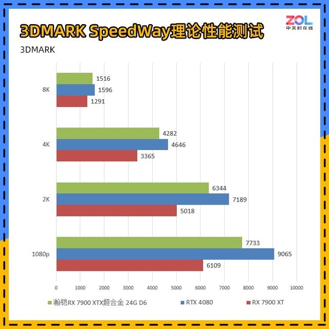 在最新的SpeedWay测试中,由于测试本身为DirectX12 Ultimate,并且结合了光线追踪反射、实时全局光照、网格着色器、体积照明、粒子和后处理等效果。作为诸多性能的综合测试,AMD仍然在光追上面吃了亏。