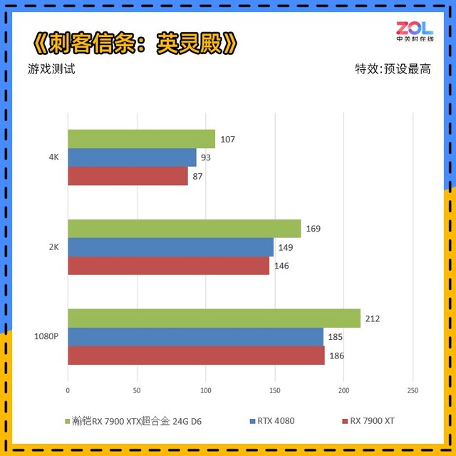 游戏实测方面,瀚铠 RX7900XTX超合金显卡依然要大幅度领先RTX 4080,众多3A游戏在4K分辨率下仍有百帧以上的高帧率。
