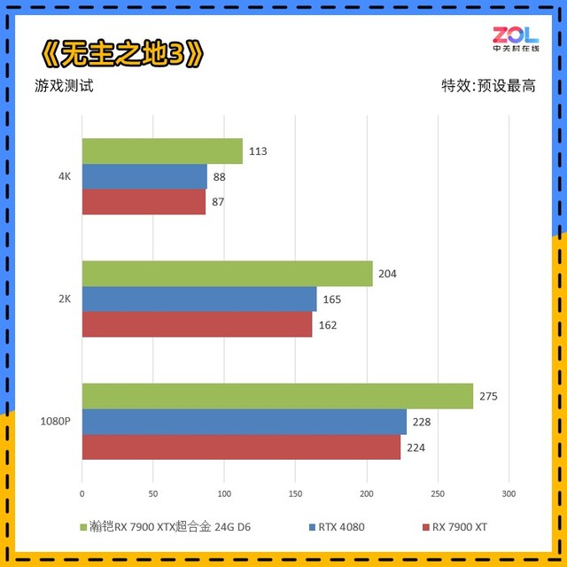 《无主之地3》中,我们测试的同样为DX 12环境,瀚铠 RX7900XTX超合金显卡相较RTX 4080的提升平均在24%左右。