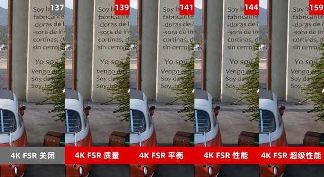整组对比的效果非常明显,不过有意思的是,在FSR关闭的情况下,由于原图较为锐利,可以看到在汽车的边缘会出现非常明显的毛边,而FSR 2.2质量模式下才是画质最好的表现,包括墙壁上材质的凹凸感。这一情况持续到FSR 2.2性能模式依然非常明显,不过在FSR 2.2超级性能模式中,颜色边界则会变得较为模糊,但整体相较原图来说,依然有着非常高的画质表现。