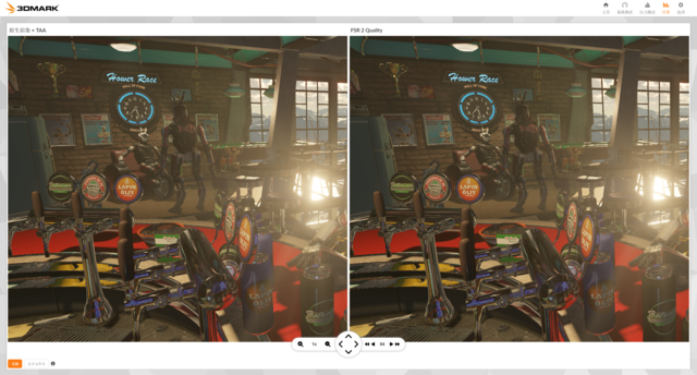我们分别选择了原始分辨率以及4倍放大进行比较,但3DMARK中的FSR并没有标明什么版本,测试的效果对比《极限竞速:地平线5》来说,锯齿感比较明显。