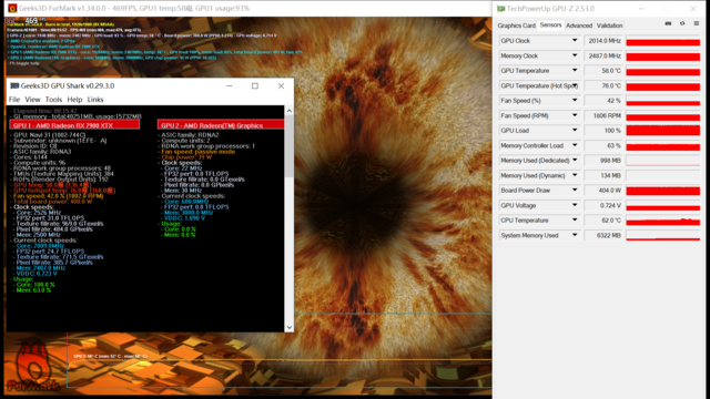 另外目前FurMark对A卡也支持了功耗的监测,可以看到GPU负载达到100%,板载功耗为404W,相比公版的355W更高。