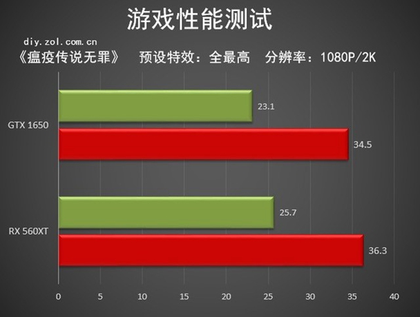 在最高画质下,二者由于本身入门级定位的原因,所以帧数表现并不是很高。不过RX560XT还是比对手在1080P和2K分辨率下领先了2帧左右,领先幅度在5%~10%之间。后来笔者又测试了一下RX560XT在中画质下的帧数表现,发现在1080P下平均帧数已经能在60帧上下,比较流畅了。