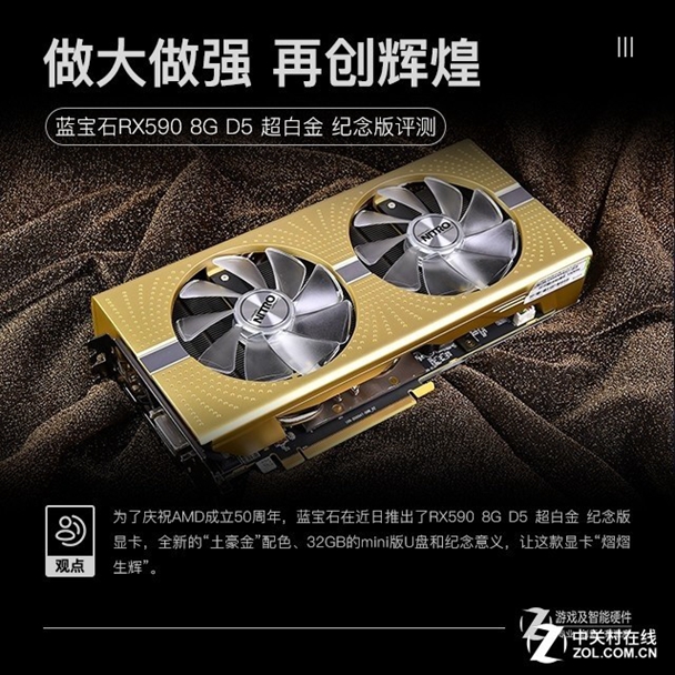而也就在五十周年庆典上,AMD推出了一系列纪念版的产品,在显卡领域上,和AMD有深度合作的蓝宝石也推出了RX590 8G D5 超白金 纪念版。今天我就为大家详细的解读一下这款显卡有什么独到之处。