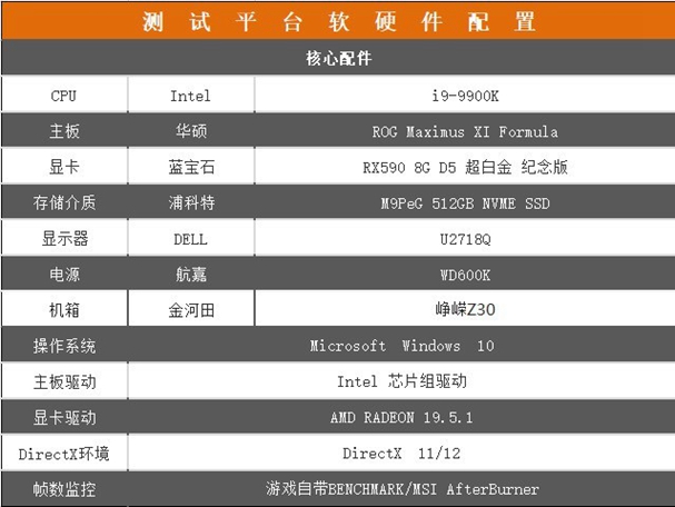 为保证此次显卡发挥最大效能,CPU采用第九代Intel八核心十六线程的i9-9900K、浦科特M9PeG 512GB NVME SSD、复仇者M3 DDR4 ×2内存、电源为航嘉 WD600K、机箱为金河田峥嵘Z30。详情请看上图。