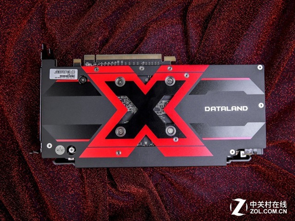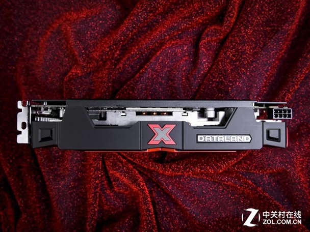 显卡顶部也非常简单,一个X型标志+DATALAND名称,非常简洁,从中间还能看到隐约漏出的散热铜管。另外显卡配置了一个8pin的额外供电。