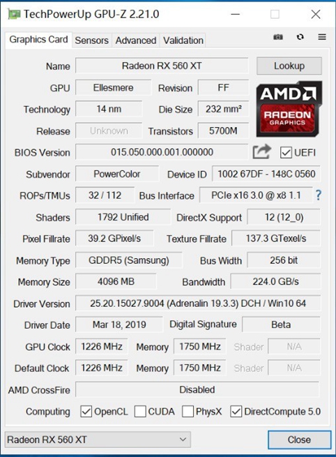 显卡参数如上图所示,RX560XT相比560D的896个shaders高出不少,达到了1792个,并且GPU频率和显存频率也有相应的提升,所以这款显卡碾压560D肯定是没问题的,所以本次测试还是主要对比价位比它稍高的GTX1650。