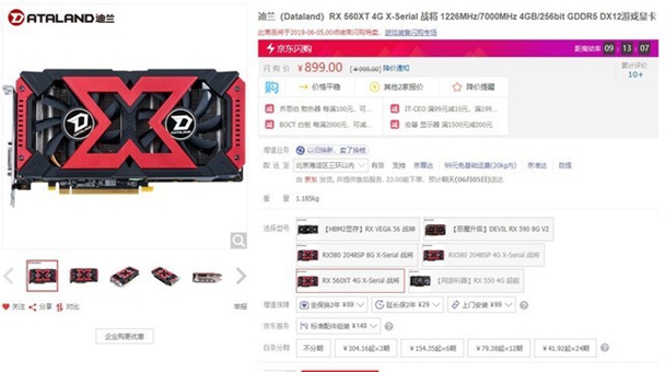 老样子,先说价格。目前在迪兰京东的官方旗舰店里,这块迪兰 RX560XT 4G X-Serial战将显卡正在以899元的价格售卖,要知道这块卡的初始价格是999元,在5月15日以后就一直899元这么卖了。
