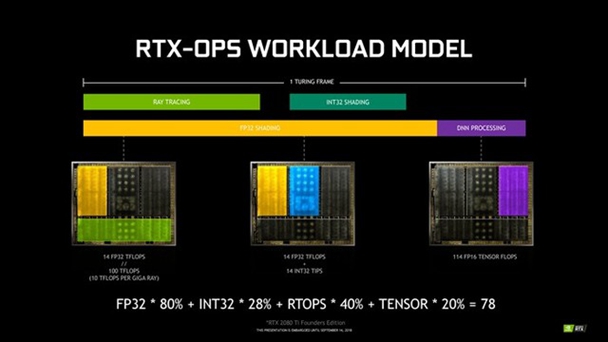 而关于性能方面,由于是新技术,NVIDIA官方定义了一个光线追踪的计算方式,其单位为RTX-OPS,公式如上图所示。其中RTX2080Ti为78T的RTX-OPS;RTX2080则为 60T。而至于上一代的Pascal GTX 1080Ti也同样适用于这个公式,但因为没有RT CORE和TENSOR CORE,数值仅为11.3T,无法满足实时光线追踪的需求。
