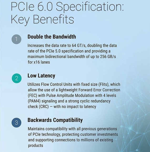 规格方面,PCIe6.0的每通道64GT/s原始数据速率,x16配置下可达成256GB/s带宽;利用行业现成PAM4方案,支持4级信号脉冲幅度调制;轻量级前向纠错(FEC)和循环冗余校验(CRC)方案,有助缓和PAM4信令相关的误码率增长;支持基于Flit的流控制单元编码和PAM4调制,实现翻倍的带宽增益;更新Flit模式中使用的数据包布局,旨在提供附加功能并简化处理;保留与所有前几代PCIe技术的向后兼容性。