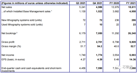 2021年在缺芯的主旋律下度过,虽然芯片短缺,但是半导体行业的营收、增长等各方面还是非常不错的。光刻机巨头ASML在1月19日公布2021年财报,第4季度及2021全年业绩均创历年新高且优于预期。ASML在2021年营收为186.11亿欧元,同比增长35%,毛利率52.7%,净利润为58.83亿欧元。其中,2021年第4季营收为49.86亿欧元,净利润为17.74亿欧元,毛利率54.2%。