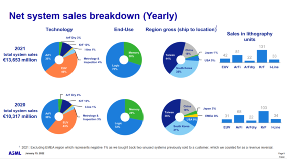 ASML在2021年共销售287台光刻系统,贡献136.53亿欧元。其中42台为EUV光刻系统机,贡献约63亿欧元营收,销售额占比高达46%;ArFi光刻系统81台,销售额占比36%;ArF光刻系统131台,销售额占比10%;i-Line光刻系统33台,销售额占比1%。从光刻系统的最终用途来看,70%用于逻辑半导体制程,30%用于存储芯片的制造。最终出货地方面,中国台湾地区贡献的销售额占比高达44%,韩国占比35%,中国大陆占比16%。