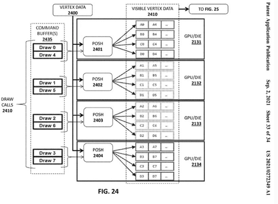 根据英特尔专利的描述,把多个图形绘制指令传送到多个图形处理器。第一图形处理器实质上运行整个场景的初始绘制通道,创建可见性和障碍数据,并决定渲染哪些内容。