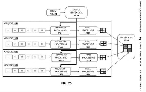 从英特尔的专利描述可以看到,英特尔希望在MCM设计的GPU实现多芯片同步渲染,不同于NVIDIA和AMD曾经的速力(SLI)和交火(Crossfire),英特尔希望通过MCM封装的方法,让多个图形单元能够在第一图形处理器的协同下,在多个不同的专用芯片或图形单元上进行计算、渲染,再通过第一图形处理器组合成最终画面。