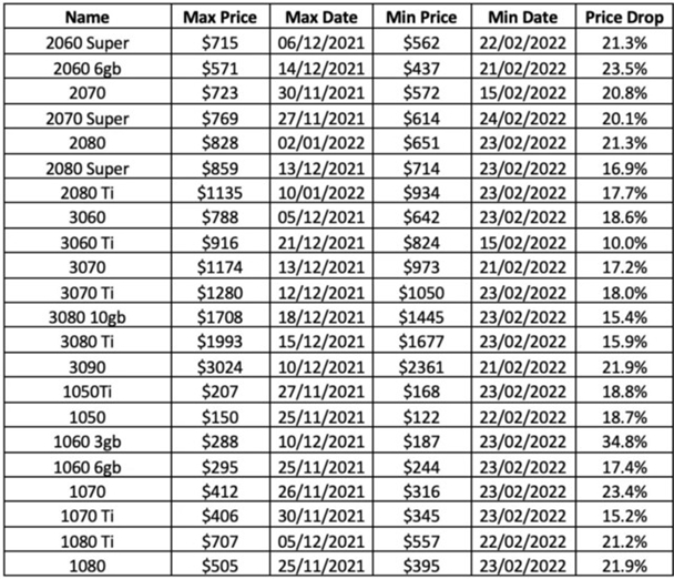 Techradar网站统计了美国ebay上各种显卡的价格,从去年12月左右到现在的2个多月中,GTX 10系列、RTX20系列和RTX30系列显卡的价格都有下滑,少则10%,多则35%。