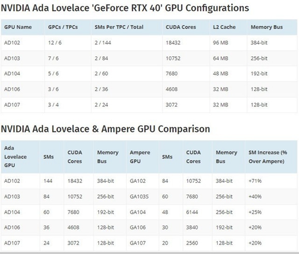 与RTX30系列分配类似,RTX40显卡核心在AD102之下也还有AD103、AD104、AD106以及AD107,其中AD103核心拥有84组SM单元,最多10722个CUDA核心,规模比GA103提升40%。之后的AD104、AD106以及AD107,核心规模对比对位的RTX30系列显卡核心拥有25%与20%的提升。