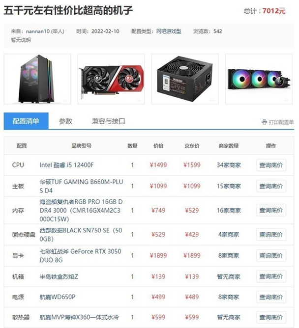 这名网友的配置主题为【五千元左右性价比超高的机子】,由于产品库的实时价格与电商略有出入,下面笔者从京东按照相同配置整理了一份价格。
