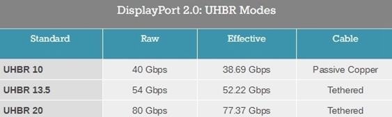 由于这一标准的存在,DP 2.0的电缆事实上也是有区别的,VESA联合会终于做出决定,给不同的电缆做证书,以期辨别。DP 2.0电缆会依照速度不同有2种标准,DP40的电缆在内部的4个通道中支持每通道10Gbps的UHBR 10标准,总速度是40Gbps;标示为DP80的电缆则是每通道20Gbps的UHR20标准,速度可达80Gbps。DP40、DP80电缆也因此得到明确的辨别,厂商想科弱的可能性大幅降低。