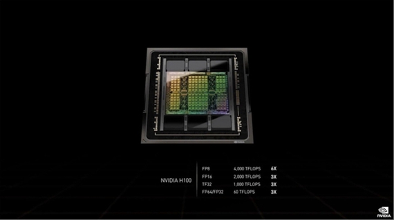 性能方面,GH100核心的FP64/FP32达到60TFlops(每秒钟60PFLOPS),FP16为2000TFlops(每秒钟2000PFLOPS),TF32为1000TFlops(每秒钟1000PFLOPS),两倍于A100;4000TFlops(每秒钟4000PFLOPS)的FP8十倍于A100。