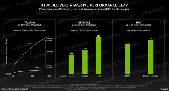 性能方面,H100计算卡的AI互联网资源32PFlops(每秒钟3.2亿万次),480TFlops(每秒钟480PFLOPS)的FP64浮点数互联网资源、每秒钟1.6PFlops(每秒钟1.6千PFLOPS)的FP16互联网资源、3.2PFlops(每秒钟3.2千万次)的FP8互联网资源,分别是前代DGX A100的3倍、3倍、6倍,而且新增支持互联网内计算,性能3.6TFlops。