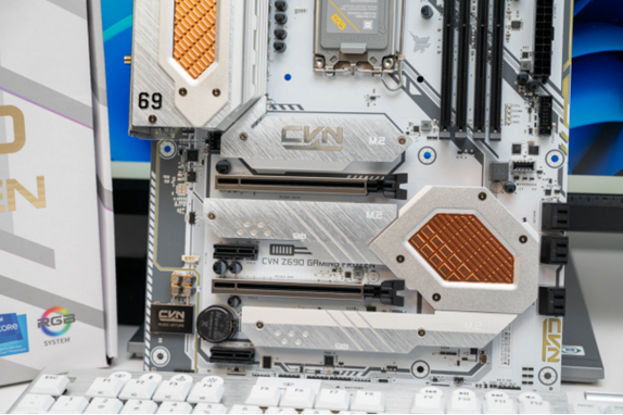 另外,七彩虹 Z690 GAMING FROZEN V21强悍的可扩展性也体现在插槽数量上,主板拥有3个M.2插槽,因此全数覆盖有厚实的散热主炮,可以为PCIe4.0固态的散热作出贡献。