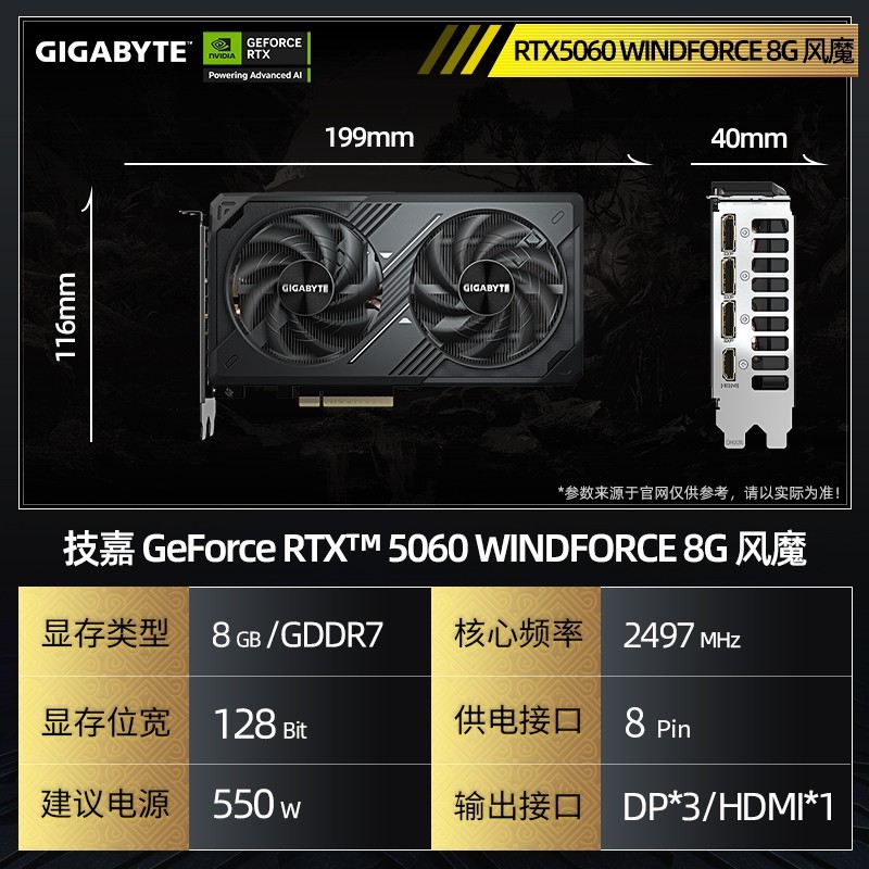 技嘉 RTX5060 WINDFORCE 8G 显卡现已开启限时优惠,这款性能强劲的电竞显卡采用先进的制程工艺与高效散热设计,搭载8GB大显存和WINDFORCE风之力散热系统,确保长时间稳定运行,无论是主流游戏还是内容创作都能流畅应对。