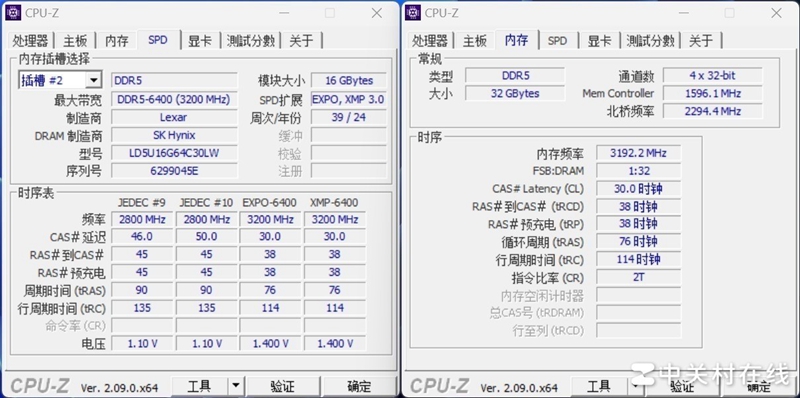 测试前我们先用CPU-Z查看下Lexar雷克沙ARES战神之翼DDR5-6400 RGB内存的基本参数,采用SK海力士颗粒,XMP/EXPO性能为6400MT/s,完整时序为30-38-38-76,而通常来说DDR5内存频率越高时序也要高一些。