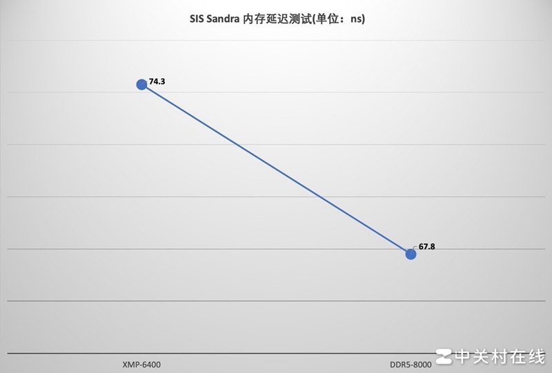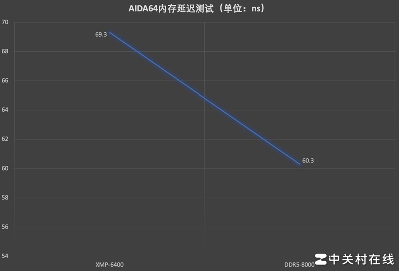 延迟方面,在XMP-6400频率下为69.3ns,超频至8000频率后延迟下降到60.3ns,降幅高达9.3ns,可见大幅度频率提升完全可以抵消高时序带来的不利影响。