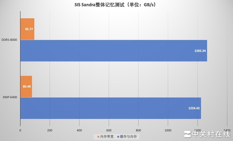 在SiS Sandra的整体记忆测试中,XMP-6400频率初始带宽成绩为80.48GB/s,缓存与内存成绩1224.42GB/s,延迟74.3ns;超频至8000频率带宽成绩达到了95.77GB/s,缓存与内存成绩达到1265.34GB/s延迟则降低至67.8ns。