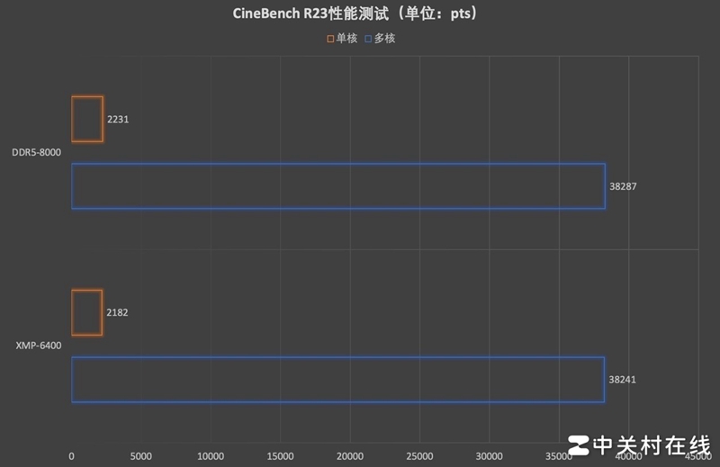 在常用CPU测试软件CineBench R23测试中,XMP-6400频率单核成绩为2182pts,多核成绩为38241pts;超频至8000频率单核成绩达到了2231pts,多核成绩为38287pts,内存频率提升也有效提升了CPU的效能。