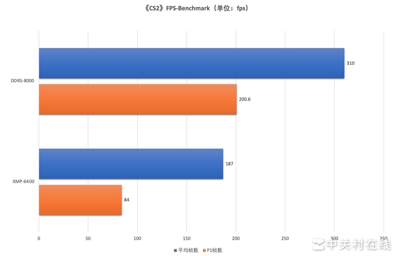 最后是《CS2》的FPS-Benchmark测试,通过游戏跑分形式来体现内存超频前后的变化。XMP-6400频率平均帧数为187fps,P1帧率为84fps;超频至8000频率平均帧数提升到了310fps,P1帧数更是提升至200.6fps,可见频率大幅提升进一步降低了延迟,让电竞游戏的帧数得到巨大提升。