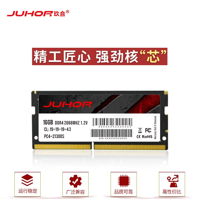 玖合 16GB DDR4 2666笔记本内存条,精选高品质颗粒,搭配三维立体透明膜封装技术,做工精细可靠。玖合 16GB DDR4 2666内存条拥有16GB大容量,基础频率2666MHz,工作电压仅为1.2V,时序为19-19-19-43,能够为您的笔记本电脑带来更强劲的性能提升和更流畅的使用体验。