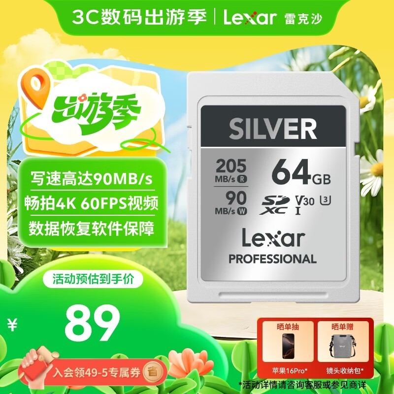 雷克沙 U3 V30 64GB SD存储卡 数码微单单反相机SD卡 读205MB/s 写90MB/s 畅拍4K SILVER系列 SD银卡