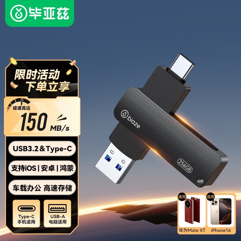 毕亚兹 UP-06 256GB Type-C双接口手机U盘 USB3.2高速两用U盘 安卓苹果手机电脑通用优盘