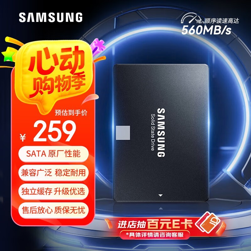 三星 870 EVO SATA固态硬盘250GB,现京东活动售价仅259元,还可叠加使用200-20PLUS补贴券及200-20优惠活动,下单1件后实付低至219元,性价比极高。三星 870 EVO固态硬盘采用三星V-NAND 3bit MLC颗粒,具备出色的稳定性和耐用性,顺序读取速度高达560MB/s,顺序写入速度可达530MB/s,4K随机读写表现也十分优秀。三星 870 EVO SATA 3.0接口设计兼容性强,同时还配备相应容量的DDR4缓存,为您的电脑带来更流畅的运行体验,是升级存储的优选之选。