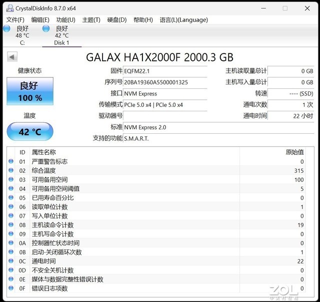 通过Crystal Disk Info的信息,可知影驰名人堂HOF EXTREME 50S的产品名称与HOF EXTREME 50 2TB一致,实际容量也为2000.3GB,但是固件版本不同,采用PCIe5.0x4传输模式,支持NVMe2.0标准,在26℃室温下待机温度42℃,对于一款PCIe5.0产品来说,散热马甲功不可没。